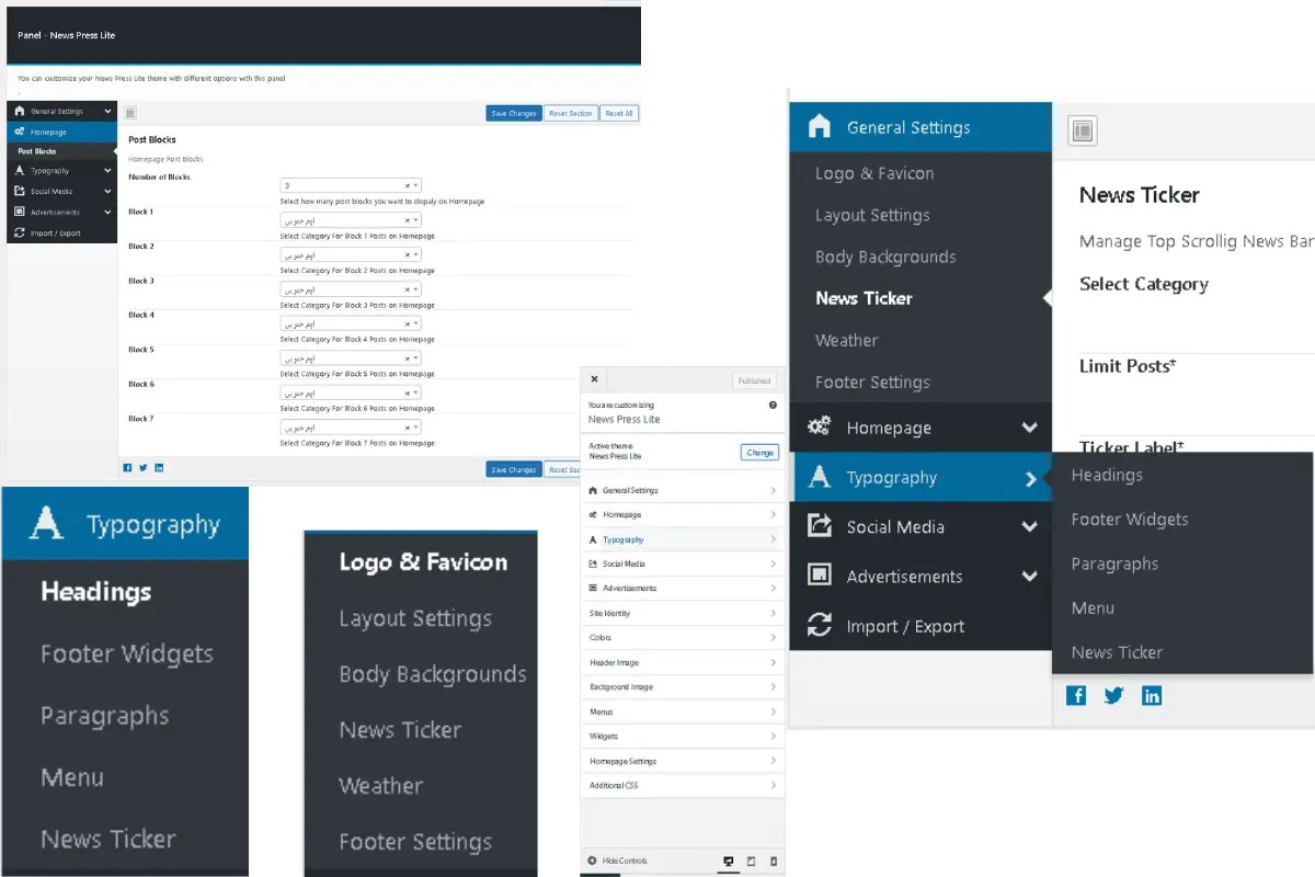 نیوز پریس لائٹ تھیم کا ایڈمن پینل نہایت طاقتور، آسان اور مکمل طور پر کسٹمائز ایبل ہے۔ یہاں سے آپ اپنی پوری ویب سائٹ کے ڈیزائن، رنگ، فونٹس، لے آؤٹ، ویجٹس اور ہیڈر اسٹائل کو چند کلکس میں تبدیل کر سکتے ہیں۔ کسی کوڈنگ کی ضرورت نہیں، سب کچھ یوزر فرینڈلی انٹرفیس کے ذریعے ممکن ہے۔ آپ ہوم پیج ویجٹس، بریکنگ نیوز ٹِکر، فوٹر، مینو، اور سائڈبار کو اپنی پسند کے مطابق سیٹ کر سکتے ہیں۔ ایڈمن پینل میں موجود لائیو کسٹمائزر کی مدد سے آپ تبدیلیاں فوراً دیکھ سکتے ہیں