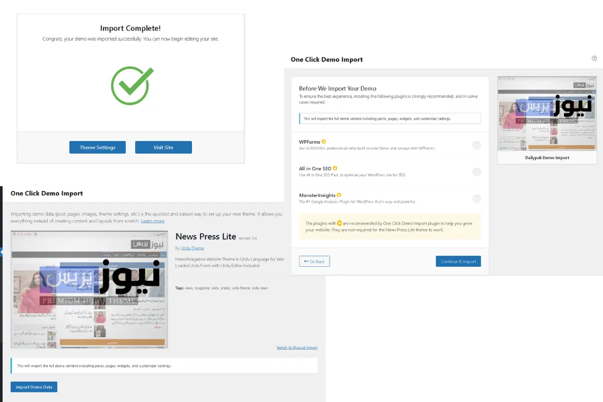 نیوز پریس لائٹ تھیم میں ون کلک ڈیمو انسٹالیشن کی سہولت موجود ہے، جس کی مدد سے آپ چند لمحوں میں اپنی ویب سائٹ کو بالکل ڈیمو جیسا بنا سکتے ہیں۔ کسی تکنیکی مہارت یا کوڈنگ کی ضرورت نہیں، بس ایک کلک کریں اور مکمل ڈیمو ویب سائٹ خود بخود انسٹال ہو جاتا ہے، جس میں تمام پیجز، مینو، ویجٹس اور تصاویر پہلے سے سیٹ ہوتے ہیں۔ اس فیچر کی بدولت نئے صارفین بھی آسانی سے اپنی ویب سائٹ کو پروفیشنل نیوز پورٹل کی شکل دے سکتے ہیں۔