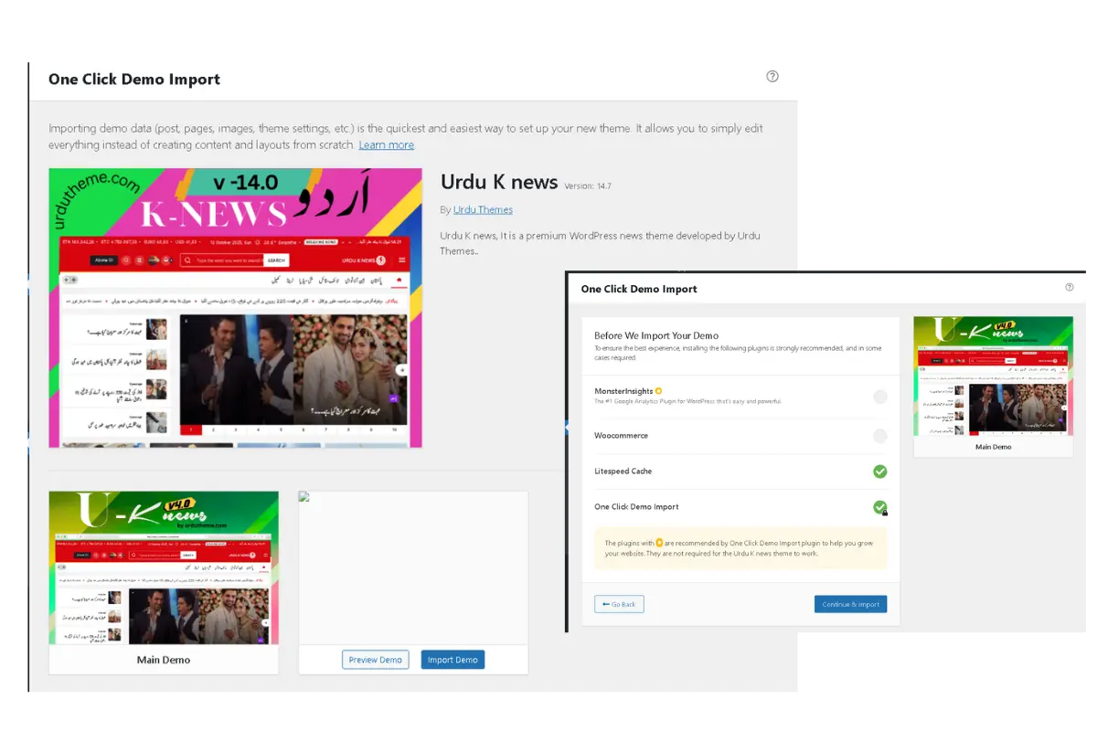 اُردو کے نیوز تھیم میں آپ کو ڈیمو امپورٹ کرنے کا آپشن مل جاتا ہے، جسے آپ امپورٹ کر کے آسانی سے آپنی نیو وئب سائٹ کی ڈیمو کے مطابق سیٹنگ اور کسٹمائز کر سکرتے ہیں، ڈیمو کو امپورٹ کرنا نہائت ہی آسان ہے۔ آپ صرف ایک کلک میں یہ کر سکتے ہیں۔